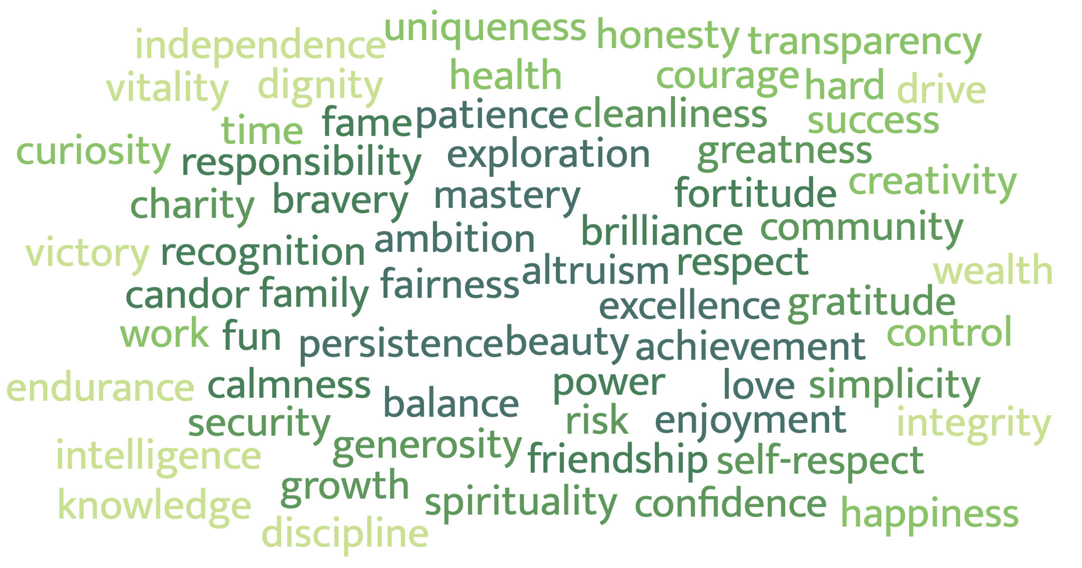 The above is a common assortment of potential values. The first step is to choose wisely from this list the values that are truly meaningful to you, those that resonate in an authentic way. Don't hesitate to create a value of your own if the 'just-right' word doesn't appear in the cloud. And, if a cloud of words feels a bit soupy to your brain, here's a list.The ones you choose should not be so-called "resumé" values, standards you ought to care about, principles your boss workshopped at the turn of last decade, or big cliché nouns atop your LinkedIn page.These are "eulogy" values: the deep, foundational principles that make you feel dignified and proud to consider as yours. Virtues you'll be remembered for in the long game of life.Go to "Sorting" for next instructions.